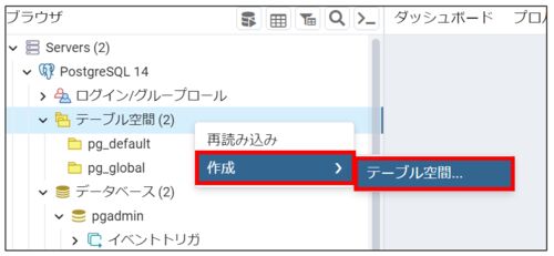 PostgreSQL 目次 テーブルスペース管理画面の開き方「テーブル空間」を右クリック→作成→テーブル空間 ■General」タブでは以下の情報を設定する ・名称:テーブルスペースを識別するための名前 ・所有者:テーブルスペースの所有者となるユーザー ■「定義」タ…