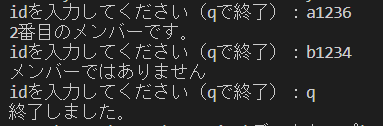#リストを設定する id_List = ["a2345","a1236","b7656","f0987"] while True: id = input("idを入力してください(qで終了):") if id == "q": print("終了しました。") break #例外処理 try: pos = id_List.index(id) print(str(pos + 1) + "番目のメンバーです。") except: print("メンバーではありません")